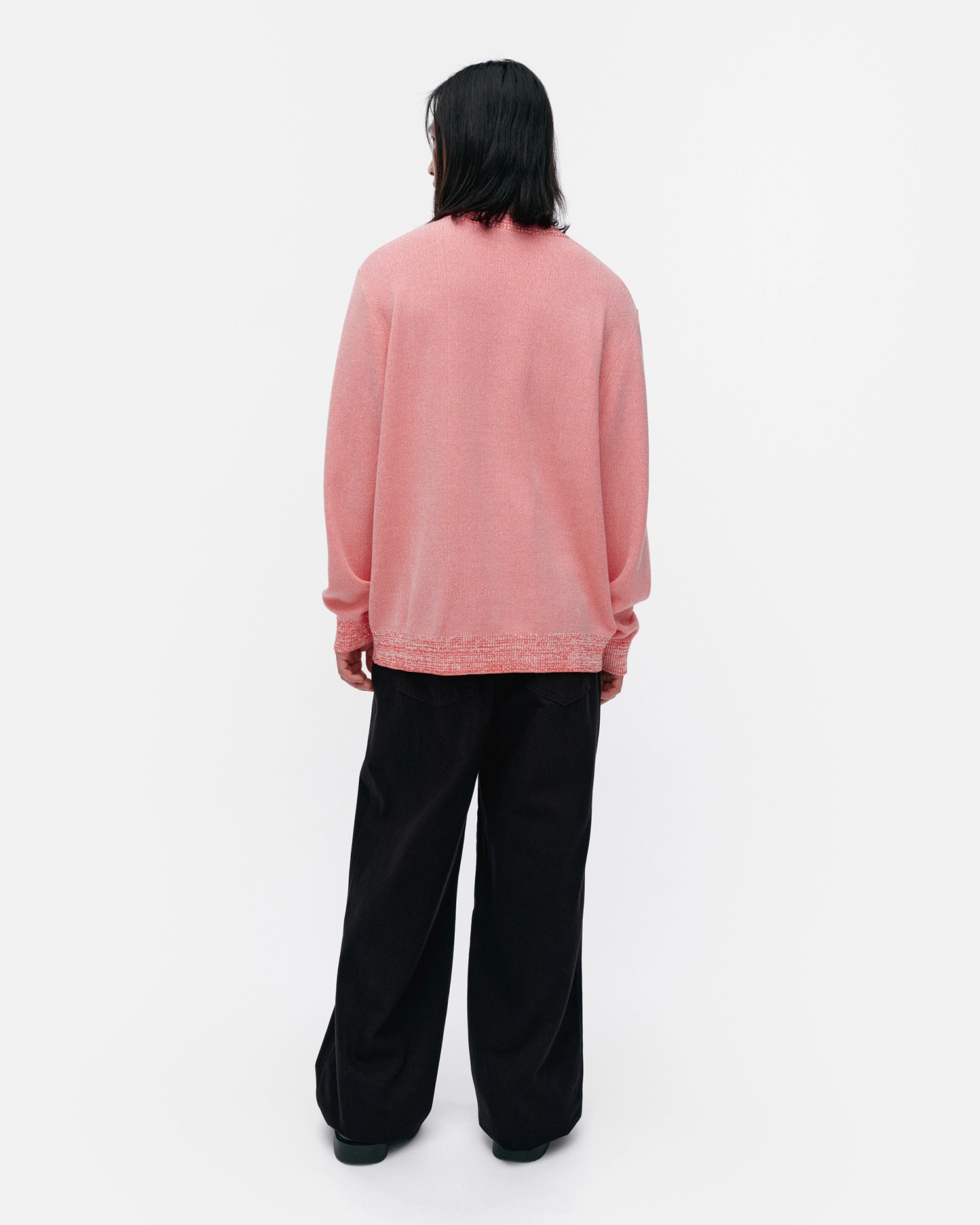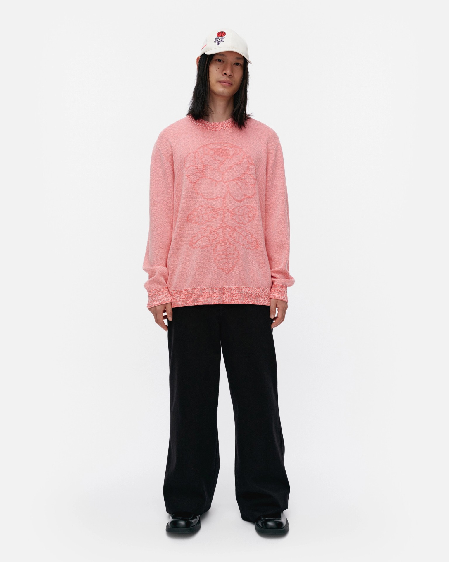 The Lasi knitted jumper is made of organic cotton, and it has a relaxed, unisex fit. The product contains 2% polyamide in ribbings. The jacquard knit jumper features the large Vihkiruusu flower in the front. It has a double-ribbed O-neck and wide ribbing at the sleeve ends and hemline. The jacquard knit is turned inside out on this product, giving the jumper a mélange look.