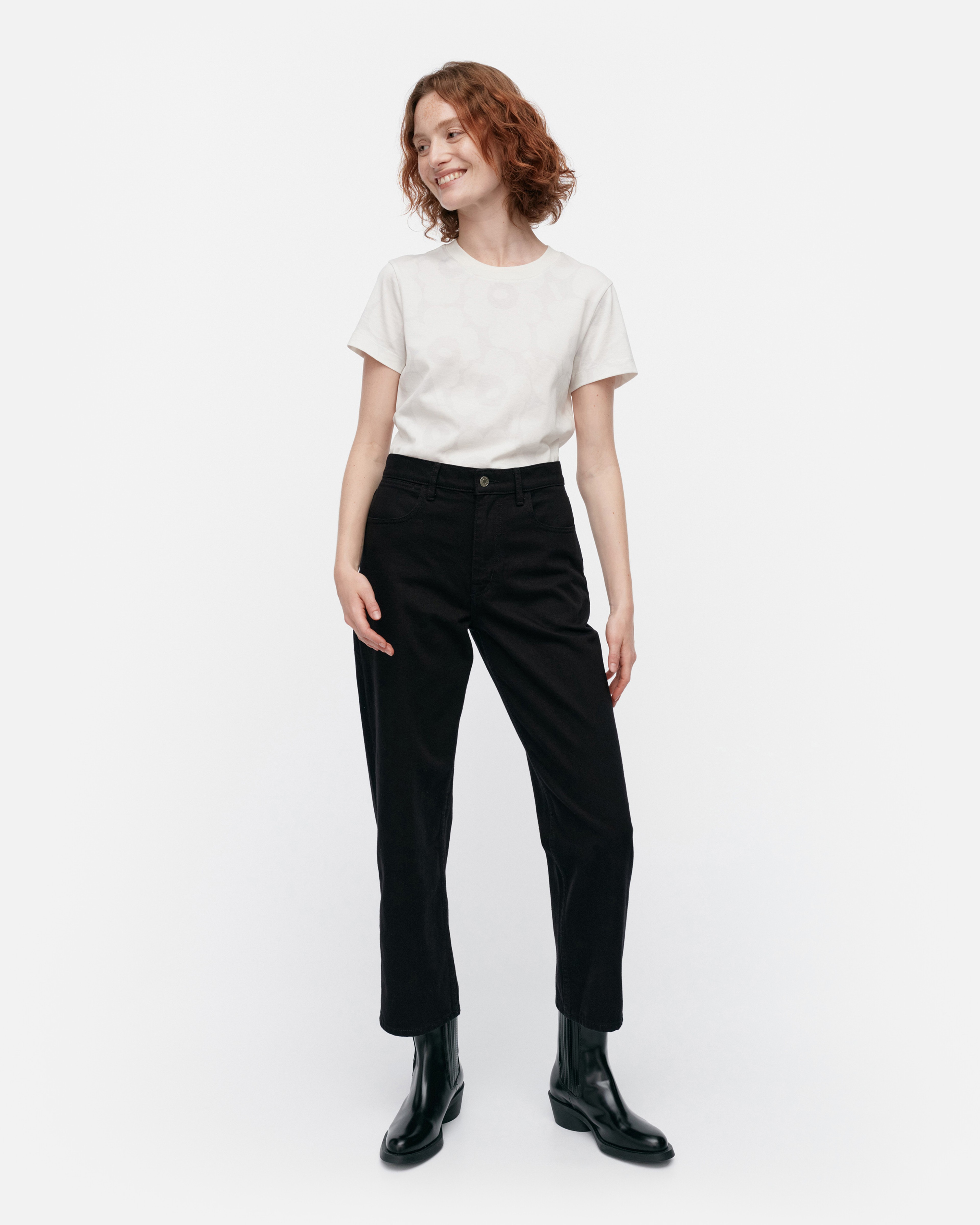The Marimekko Maridenim collection follows The Jeans Redesign guidelines by working with mono-material cotton with no stretch, of which 80% is organic cotton and 20% recycled cotton. Maridenim jeans are made with minimal use of hardware, including the use of removable buttons and no rivets. The hardware is not finished with electroplating, as per the recommendations by The Jeans Redesign guidelines. Both the wash, finish and chemical use of the garments follow the guidelines, including abstaining from traditional stone washing or the use of potassium permanganate. Instead, we use, for example, laser technology, E-Flow steam washing and ozone washing. The technology used is selected according to the desired appearance of the product.