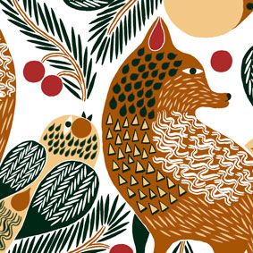 Salaperäisen lumoavaa tunnelmaa tihkuvan Ketunmarja-kuvion ketut ovat hiipineet iltahämärissä puutarhaan, jossa marjakuusen oksilla istuu pikkulintuja.