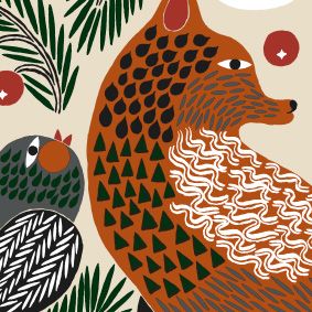 Puuvillasta valmistetussa pannulapussa on toppaus sekä lenkki ripustamista varten.Salaperäisen lumoavaa tunnelmaa tihkuvan Ketunmarja-kuvion ketut ovat hiipineet iltahämärissä puutarhaan, jossa marjakuusen oksilla istuu pikkulintuja.