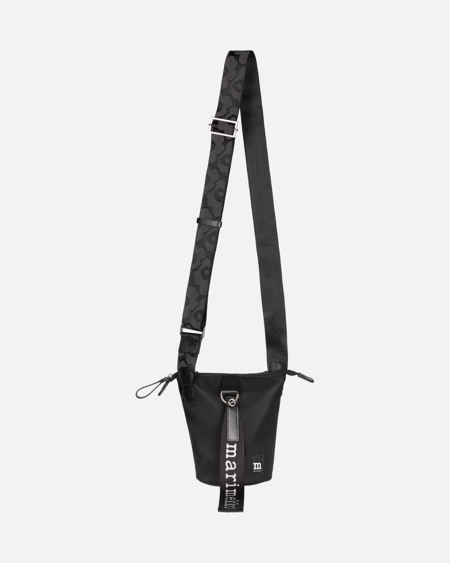 The small bag has a zipper closure and an adjustable shoulder strap with the jacquard knit Unikko pattern. The front features the Marimekko keychain and there is a slip-in pocket in the back. The bag has leather details.
